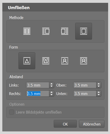 Mit Rechtsklick auf das Objekt kann mit Umfliessen die Textverdrängung eingestellt und angepasst werden. Unter Abstand wird definiert wie viele Millimeter der Text vom Objekt verdrängt wird.