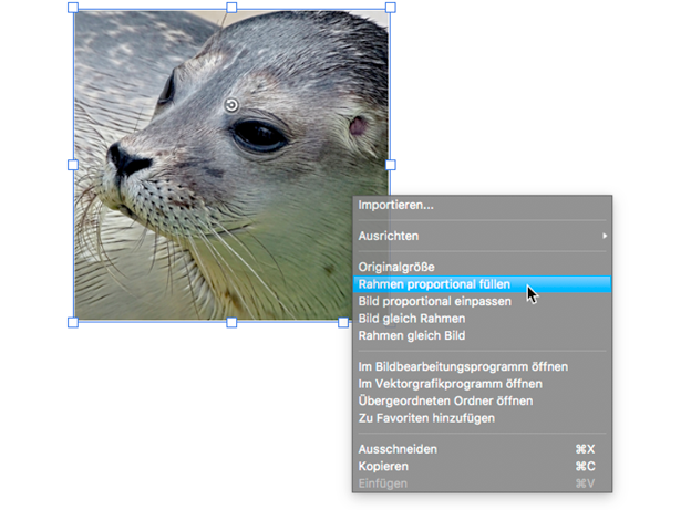 Der Befehl Bild proportional einpassen bewirkt, dass das Bild so verkleinert bzw. vergrössert wird, dass es horizontal oder vertikal die Ausmasse des Objektrahmens annimmt und gleichzeitig im Rahmen zentriert wird.